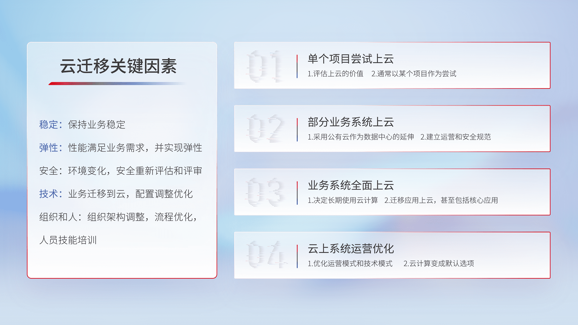 结合实际业务,,,,从规划设计、、、云平台选型、、、、云原生改造、、数据迁移、、集成交付,,迁移全过程为客户识别最佳上云路径,,做好风险识别管理,,,设计网络架构、、、身份权限、、、安全审计合规、、、操作审计、、、日志审计、、、监控告警策略、、、多站点容灾设计等,,,对云上基础设施进行整体规划,,,提升IT治理水平,,,以满足弹性、、、、高可用、、高性能的需求。。