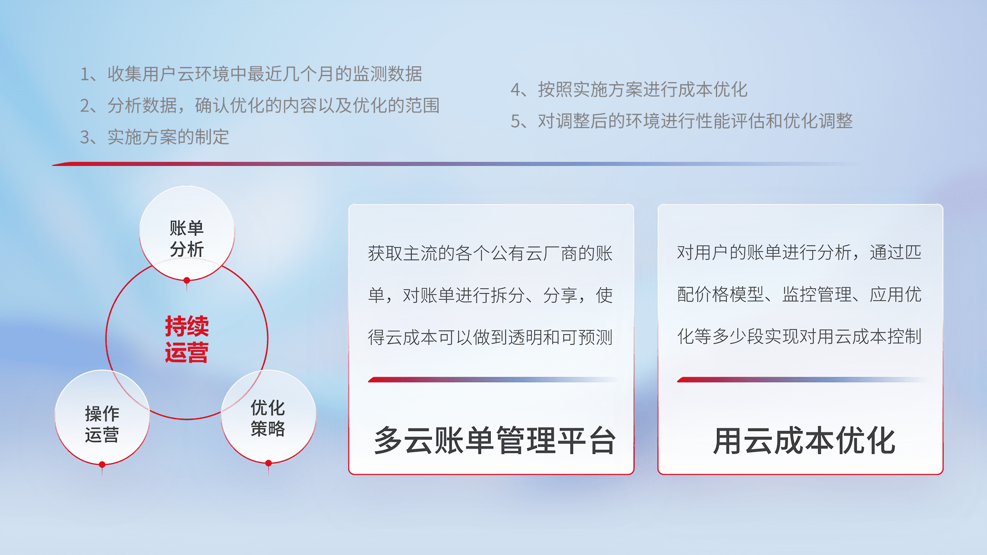 通过多云纳管,,,,以统一的资源数据模型把客户的云资源进行抽象和封装,,,进而实现对多云资源的统一操作,,保障云资源管理的可靠性、、稳定性与可用性。。量身定制化运维内容,,配置、、开发运维、、、补丁管理、、、备份、、、、监控、、、、认证和访问管理、、、、审计和日常巡检等,,保障在用云过程中的可靠度,,稳定度以及高可用率。。。。